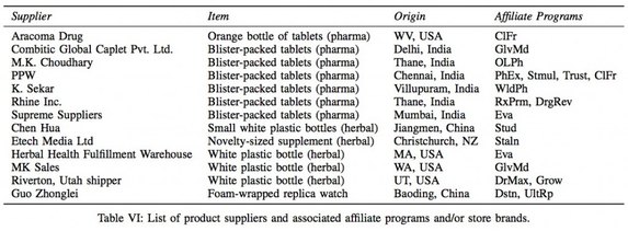 Update: One of the researchers, Stefan Savage, confirmed to me that none of the Visa cards used on the spammed sites were subsequently used fraudulently. It also looks like the pharmaceutical products were legitimate. He says “we only ordered a small subset of goods so any results aren’t representative.  However, we did some limited mass spec testing of a few pills against reference samples and the active ingredient was found to be the same and in a similar proportion — note we only tested for the active ingredient and didn’t look at things like binders, contaminants, etc.” Software was pirated, but malware free.