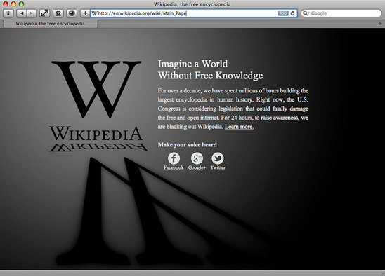 On January 18 the users and companies of the internet rallied together to protest against SOPA and PIPA, bills that would censor the internet. Check out the numbers. It worked. Here‘s part of a huge list, with even bigger names on it of the sites that participated in the blackout. Google, Wikipedia, Reddit, BoingBoing and Wired are among them. Here’s the page Wikipedia displayed. The Wikipedia page about SOPA and PIPA was accessed more than 162 million times during the 24 hours the site was blacked out. More than eight million people looked up their elected representatives’ contact information via Wikipedia’s tool, crashing the Senate’s website. At one point, 1% of all tweets on Twitter included the #wikipediablackout hashtag.
